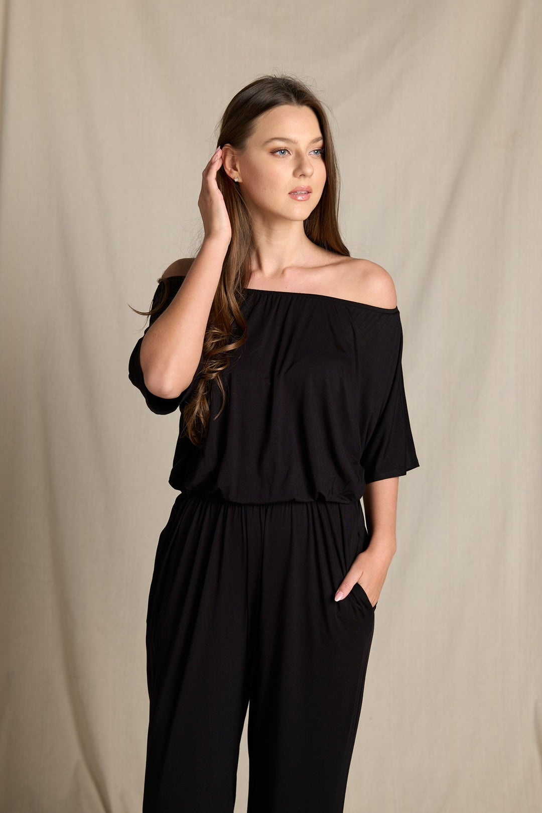 Our Joy Off-the-shoulder Jumpsuit with pockets is all you need to make a fashion statement at any occasion. This jumpsuit features a flattering off-the-shoulder neckline that adds a touch of femininity and elegance. The wide leg design not only elongates your silhouette but also ensures a comfortable and relaxed fit.
